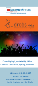 Der Fachtag am Mittwoch, den 8.10.25 von 10:00 bis 15:30 Uhr bietet Fachvorträge von Expert*innen, sowie einen Raum für Informationen, Austausch und fachübergreifende Diskussionen. Das Projekt „Nightline“ wird sich mit seiner Arbeit und den bestehenden Herausforderungen im Nachtleben in Halle (Saale) vorstellen. Zudem ist die Aidshilfe mit einem Stand und Informationsmaterialien vertreten.